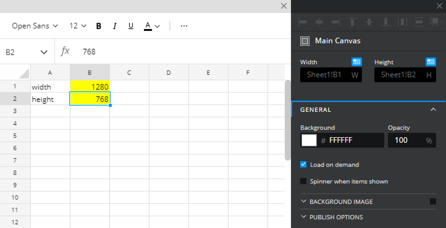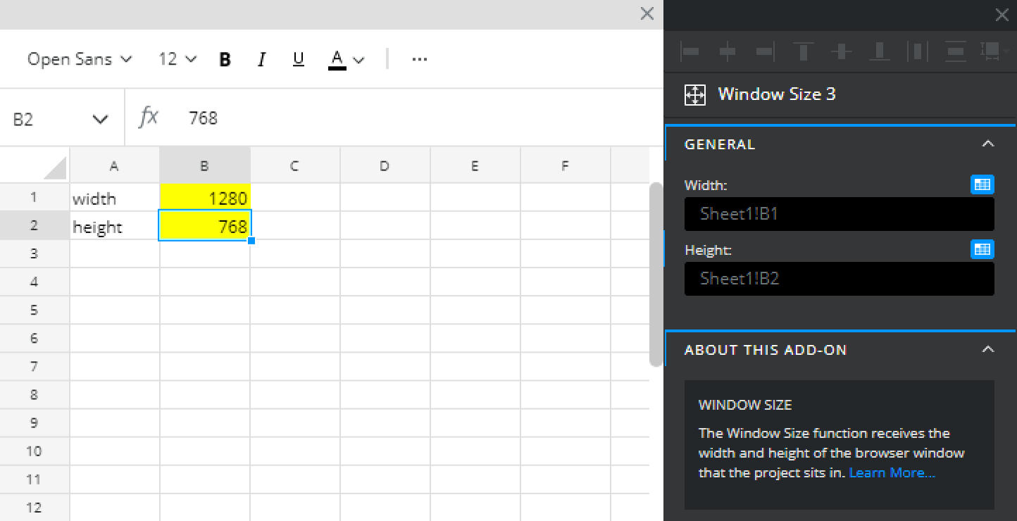 Now these are bound to the same cells, they essentially become connected. The Window Size function will read the width and height of the browser of the published project, feed this back to the ‘behind-the-scenes’ spreadsheet, and dynamically update the canvas size to match.