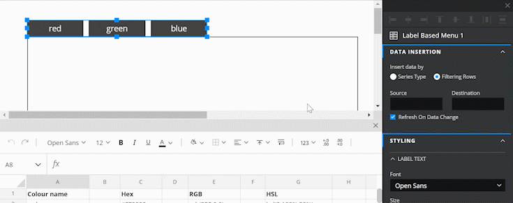 Filtering Rows – Selecting this option of the Insert data by property will change the appearance of the DATA INSERTION section. This option only allows for one series of data insertions to happen on the selection of a label from the Label Based Menu.