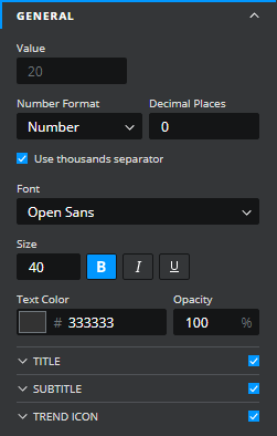The GENERAL property section controls the appearance of the Value, Title, Subtitle and Trend Icon of the tile.