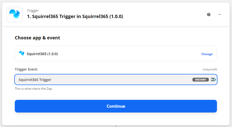 In Zapier, create a new Zap and select the Squirrel365 app and trigger event.