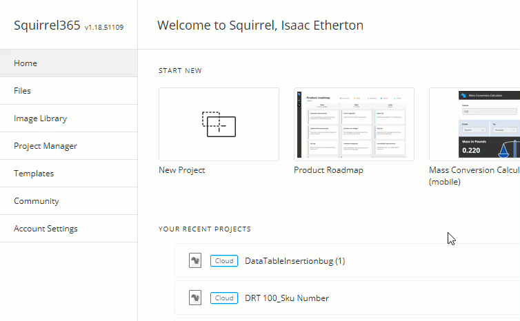 After launching Squirrel365, there are a couple of ways to **Create a Project**, including starting a **New Project** or opening a **template**.